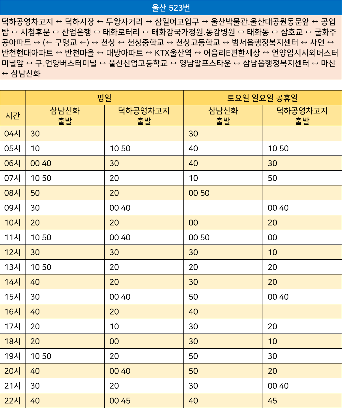 울산 523번: 덕하공영차고지 ↔ 덕하시장 ↔ 두왕사거리 ↔ 삼일여고입구 ↔ 울산박물관.울산대공원동문앞 ↔ 공업탑 ↔ 시청후문 ↔ 산업은행 ↔ 태화로터리 ↔ 태화강국가정원.동강병원 ↔ 태화동 ↔ 삼호교 ↔ 굴화주공아파트 ↔ (← 구영교 ←) ↔ 천상 ↔ 천상중학교 ↔ 천상고등학교 ↔ 범서읍행정복지센터 ↔ 사연 ↔ 반천현대아파트 ↔ 반천마을 ↔ 대방아파트 ↔ KTX울산역 ↔ 어음리E편한세상 ↔ 언양임시시외버스터미널앞 ↔ 구.언양버스터미널 ↔ 울산산업고등학교 ↔ 영남알프스타운 ↔ 삼남읍행정복지센터 ↔ 마산 ↔ 삼남신화