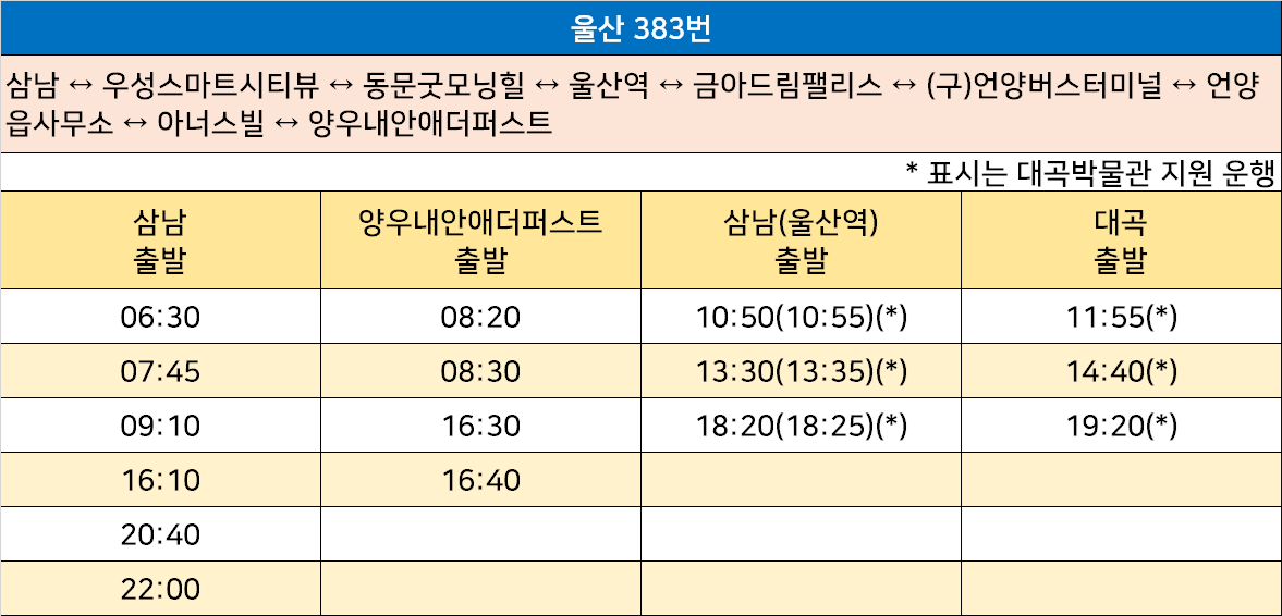 울산 383번: 삼남 ↔ 우성스마트시티뷰 ↔ 동문굿모닝힐 ↔ 울산역 ↔ 금아드림팰리스 ↔ (구)언양버스터미널 ↔ 언양읍사무소 ↔ 아너스빌 ↔ 양우내안애더퍼스트