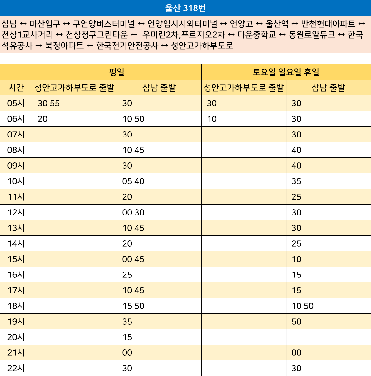 울산 318번: 삼남 ↔ 마산입구 ↔ 구언양버스터미널 ↔ 언양임시시외터미널 ↔ 언양고 ↔ 울산역 ↔ 반천현대아파트 ↔ 천상1교사거리 ↔ 천상청구그린타운 ↔ 우미린2차,푸르지오2차 ↔ 다운중학교 ↔ 동원로얄듀크 ↔ 한국석유공사 ↔ 북정아파트 ↔ 한국전기안전공사 ↔ 성안고가하부도로