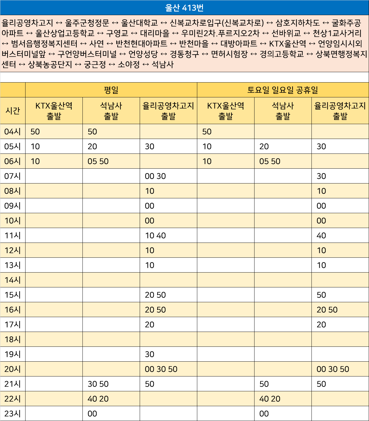울산 413번: 율리공영차고지 ↔ 울주군청정문 ↔ 울산대학교 ↔ 신복교차로입구(신복교차로) ↔ 삼호지하차도 ↔ 굴화주공아파트 ↔ 울산상업고등학교 ↔ 구영교 ↔ 대리마을 ↔ 우미린2차.푸르지오2차 ↔ 선바위교 ↔ 천상1교사거리 ↔ 범서읍행정복지센터 ↔ 사연 ↔ 반천현대아파트 ↔ 반천마을 ↔ 대방아파트 ↔ KTX울산역 ↔ 언양임시시외버스터미널앞 ↔ 구언양버스터미널 ↔ 언양성당 ↔ 경동청구 ↔ 면허시험장 ↔ 경의고등학교 ↔ 상북면행정복지센터 ↔ 상북농공단지 ↔ 궁근정 ↔ 소야정 ↔ 석남사