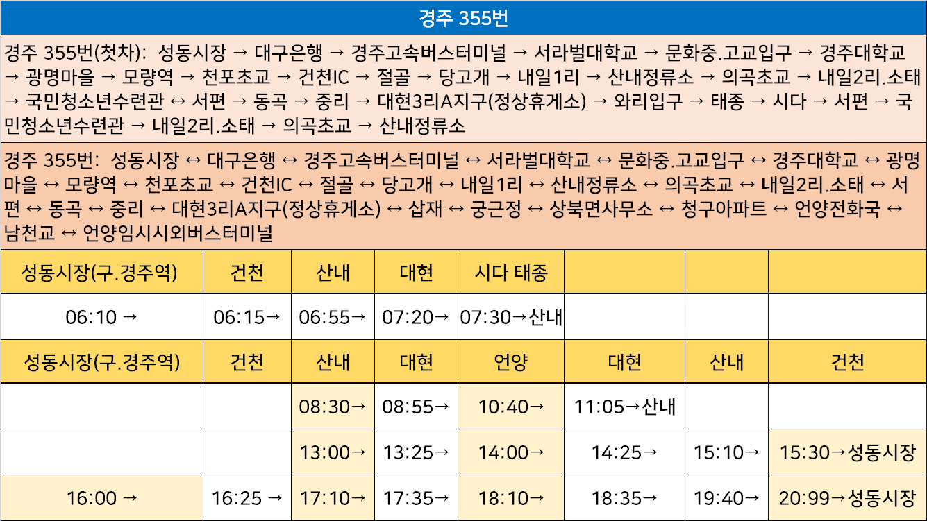 경주 355번(첫차): 성동시장 → 대구은행 → 경주고속버스터미널 → 서라벌대학교 → 문화중.고교입구 → 경주대학교 → 광명마을 → 모량역 → 천포초교 → 건천IC → 절골 → 당고개 → 내일1리 → 산내정류소 → 의곡초교 → 내일2리.소태 → 국민청소년수련관 ↔ 서편 → 동곡 → 중리 → 대현3리A지구(정상휴게소) → 와리입구 → 태종 → 시다 → 서편 → 국민청소년수련관 → 내일2리.소태 → 의곡초교 → 산내정류소