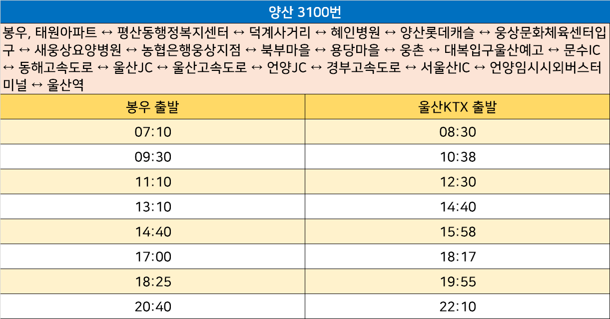 양산 3100번: 봉우, 태원아파트 ↔ 평산동행정복지센터 ↔ 덕계사거리 ↔ 혜인병원 ↔ 양산롯데캐슬 ↔ 웅상문화체육센터입구 ↔ 새웅상요양병원 ↔ 농협은행웅상지점 ↔ 북부마을 ↔ 용당마을 ↔ 웅촌 ↔ 대복입구울산예고 ↔ 문수IC ↔ 동해고속도로 ↔ 울산JC ↔ 울산고속도로 ↔ 언양JC ↔ 경부고속도로 ↔ 서울산IC ↔ 언양임시시외버스터미널 ↔ 울산역