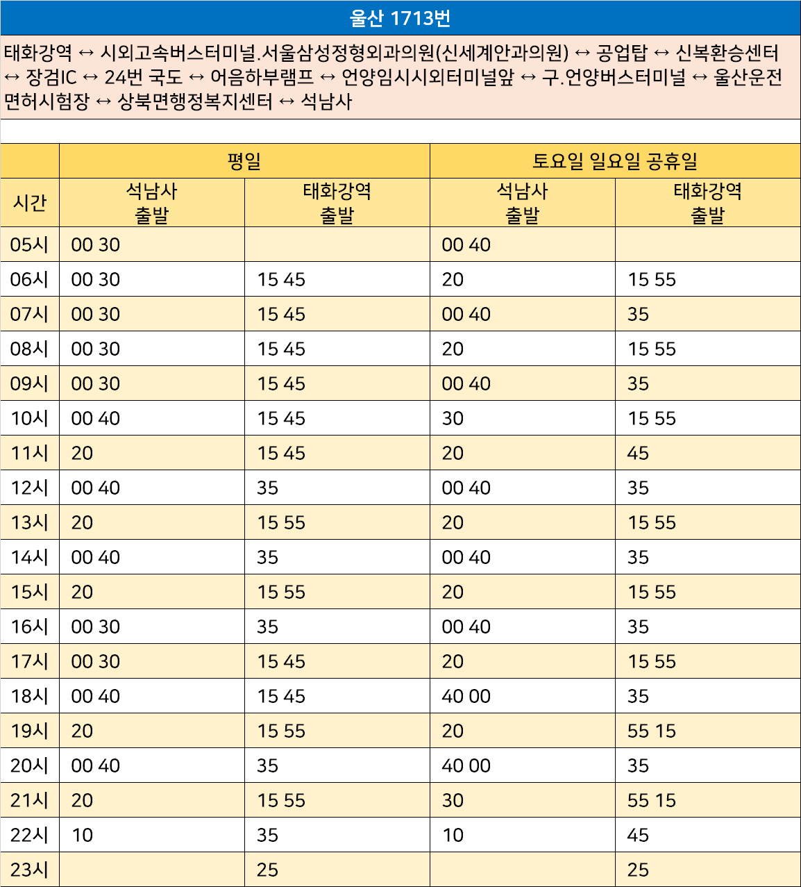 울산 1713번: 태화강역 ↔ 시외고속버스터미널.서울삼성정형외과의원(신세계안과의원) ↔ 공업탑 ↔ 신복환승센터 ↔ 장검IC ↔ 24번 국도 ↔ 어음하부램프 ↔ 언양임시시외터미널앞 ↔ 구.언양버스터미널 ↔ 울산운전면허시험장 ↔ 상북면행정복지센터 ↔ 석남사
