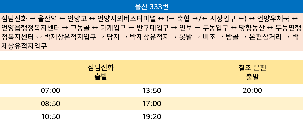 울산 333번: 삼남신화 ↔ 울산역 ↔ 언양고 ↔ 언양시외버스터미널 ↔ (→ 축협 →/← 시장입구 ←) ↔ 언양우체국 ↔ 언양읍행정복지센터 ↔ 고동골 ↔ 다개입구 ↔ 반구대입구 ↔ 인보 ↔ 두동입구 ↔ 망향동산 ↔ 두동면행정복지센터 ↔ 박제상유적지입구 → 당지 → 박제상유적지 → 옷밭 → 비조 → 밤골 → 은편삼거리 → 박제상유적지입구