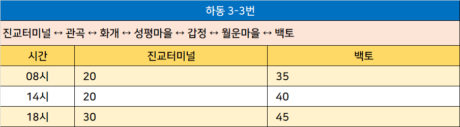 하동 3-3번: 진교터미널 ↔ 관곡 ↔ 화개 ↔ 성평마을 ↔ 갑정 ↔ 월운마을 ↔ 백토
