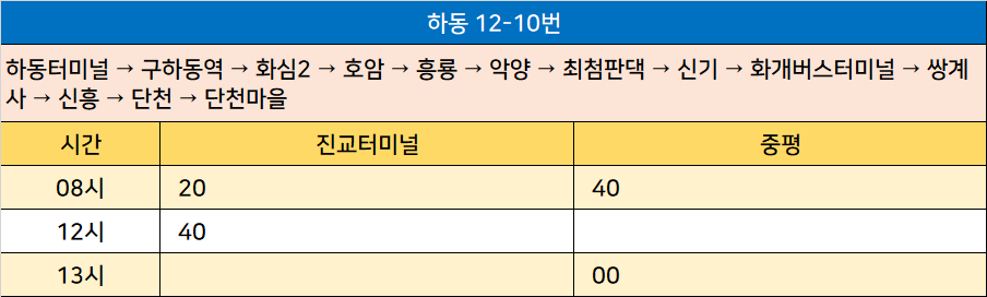 하동 12-10번: 하동터미널 → 구하동역 → 화심2 → 호암 → 흥룡 → 악양 → 최첨판댁 → 신기 → 화개버스터미널 → 쌍계사 → 신흥 → 단천 → 단천마을