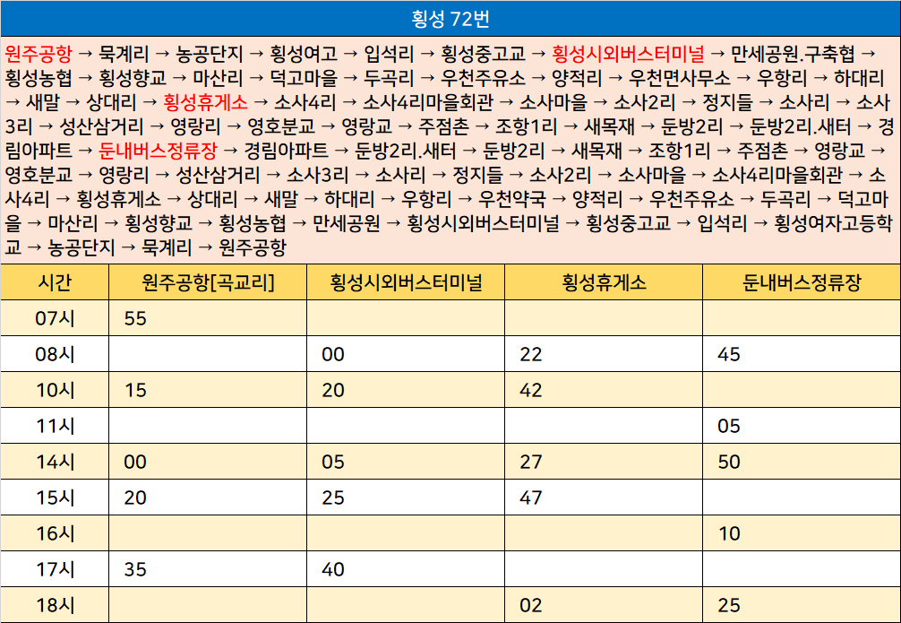 횡성 72번: 원주공항 → 묵계리 → 농공단지 → 횡성여고 → 입석리 → 횡성중고교 → 횡성시외버스터미널 → 만세공원.구축협 → 횡성농협 → 횡성향교 → 마산리 → 덕고마을 → 두곡리 → 우천주유소 → 양적리 → 우천면사무소 → 우항리 → 하대리 → 새말 → 상대리 → 횡성휴게소 → 소사4리 → 소사4리마을회관 → 소사마을 → 소사2리 → 정지들 → 소사리 → 소사3리 → 성산삼거리 → 영랑리 → 영호분교 → 영랑교 → 주점촌 → 조항1리 → 새목재 → 둔방2리 → 둔방2리.새터 → 경림아파트 → 둔내버스정류장 → 경림아파트 → 둔방2리.새터 → 둔방2리 → 새목재 → 조항1리 → 주점촌 → 영랑교 → 영호분교 → 영랑리 → 성산삼거리 → 소사3리 → 소사리 → 정지들 → 소사2리 → 소사마을 → 소사4리마을회관 → 소사4리 → 횡성휴게소 → 상대리 → 새말 → 하대리 → 우항리 → 우천약국 → 양적리 → 우천주유소 → 두곡리 → 덕고마을 → 마산리 → 횡성향교 → 횡성농협 → 만세공원 → 횡성시외버스터미널 → 횡성중고교 → 입석리 → 횡성여자고등학교 → 농공단지 → 묵계리 → 원주공항