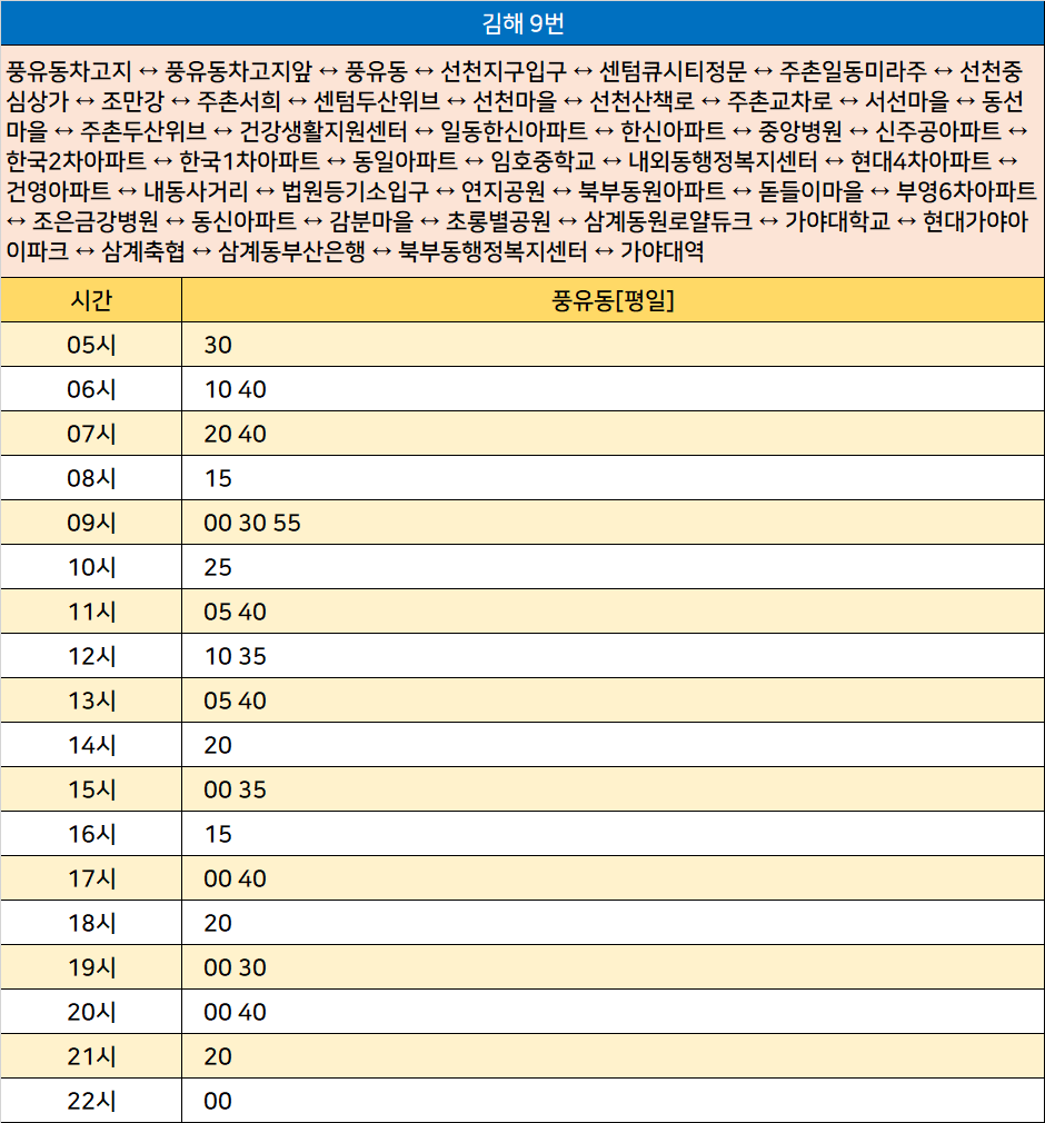 김해 9번: 풍유동차고지 ↔ 풍유동차고지앞 ↔ 풍유동 ↔ 선천지구입구 ↔ 센텀큐시티정문 ↔ 주촌일동미라주 ↔ 선천중심상가 ↔ 조만강 ↔ 주촌서희 ↔ 센텀두산위브 ↔ 선천마을 ↔ 선천산책로 ↔ 주촌교차로 ↔ 서선마을 ↔ 동선마을 ↔ 주촌두산위브 ↔ 건강생활지원센터 ↔ 일동한신아파트 ↔ 한신아파트 ↔ 중앙병원 ↔ 신주공아파트 ↔ 한국2차아파트 ↔ 한국1차아파트 ↔ 동일아파트 ↔ 임호중학교 ↔ 내외동행정복지센터 ↔ 현대4차아파트 ↔ 건영아파트 ↔ 내동사거리 ↔ 법원등기소입구 ↔ 연지공원 ↔ 북부동원아파트 ↔ 돋들이마을 ↔ 부영6차아파트 ↔ 조은금강병원 ↔ 동신아파트 ↔ 감분마을 ↔ 초롱별공원 ↔ 삼계동원로얄듀크 ↔ 가야대학교 ↔ 현대가야아이파크 ↔ 삼계축협 ↔ 삼계동부산은행 ↔ 북부동행정복지센터 ↔ 가야대역