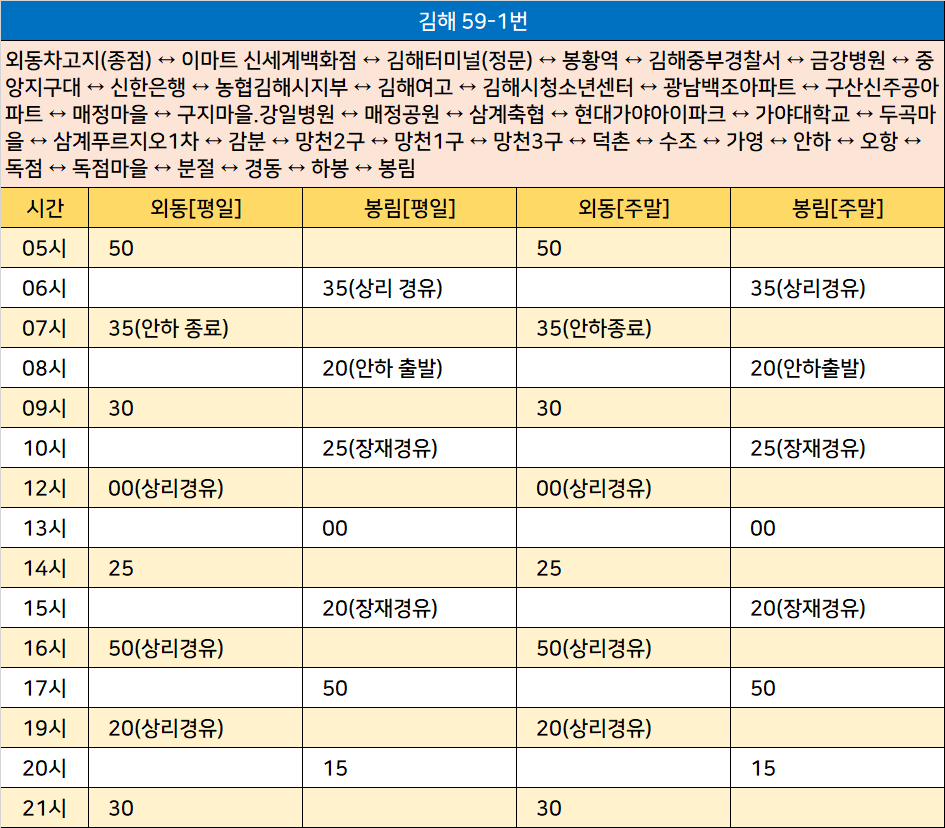 김해 59-1번: 외동차고지(종점) ↔ 이마트 신세계백화점 ↔ 김해터미널(정문) ↔ 봉황역 ↔ 김해중부경찰서 ↔ 금강병원 ↔ 중앙지구대 ↔ 신한은행 ↔ 농협김해시지부 ↔ 김해여고 ↔ 김해시청소년센터 ↔ 광남백조아파트 ↔ 구산신주공아파트 ↔ 매정마을 ↔ 구지마을.강일병원 ↔ 매정공원 ↔ 삼계축협 ↔ 현대가야아이파크 ↔ 가야대학교 ↔ 두곡마을 ↔ 삼계푸르지오1차 ↔ 감분 ↔ 망천2구 ↔ 망천1구 ↔ 망천3구 ↔ 덕촌 ↔ 수조 ↔ 가영 ↔ 안하 ↔ 오항 ↔ 독점 ↔ 독점마을 ↔ 분절 ↔ 경동 ↔ 하봉 ↔ 봉림