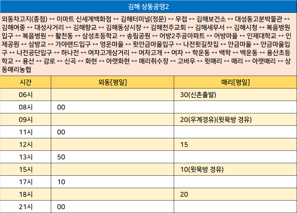 김해 상동공영2: 외동차고지(종점) ↔ 이마트 신세계백화점 ↔ 김해터미널(정문) ↔ 무접 ↔ 김해보건소 ↔ 대성동고분박물관 ↔ 김해여중 ↔ 대성사거리 ↔ 김해향교 ↔ 김해동상시장 ↔ 김해천주교회 ↔ 김해세무서 ↔ 김해시청 ↔ 복음병원입구 ↔ 복음병원 ↔ 활천동 ↔ 삼성초등학교 ↔ 송림공원 ↔ 어방2주공아파트 ↔ 어방마을 ↔ 인제대학교 ↔ 인제공원 ↔ 삼방교 ↔ 가야랜드입구 ↔ 영운마을 ↔ 윗안금마을입구 ↔ 나전윗길찻집 ↔ 안금마을 ↔ 안금마을입구 ↔ 나전공단입구 ↔ 하나전 ↔ 여차고개삼거리 ↔ 여차고개 ↔ 여차 ↔ 학운동 ↔ 백학 ↔ 백운동 ↔ 용산초등학교 ↔ 용산 ↔ 감로 ↔ 신곡 ↔ 화현 ↔ 아랫화현 ↔ 매리취수장 ↔ 고바우 ↔ 윗매리 ↔ 매리 ↔ 아랫매리 ↔ 상동매리농협
