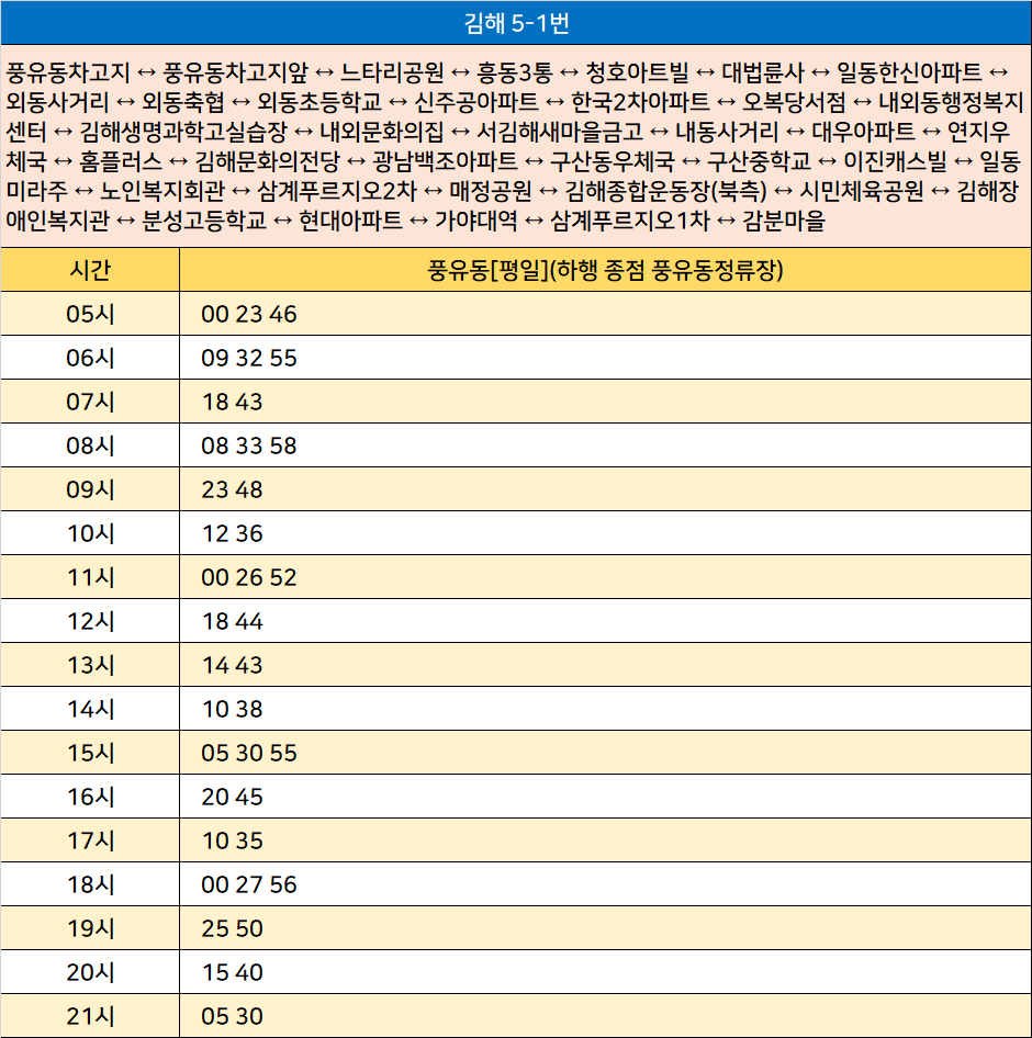김해 5-1번: 풍유동차고지 ↔ 풍유동차고지앞 ↔ 느타리공원 ↔ 흥동3통 ↔ 청호아트빌 ↔ 대법륜사 ↔ 일동한신아파트 ↔ 외동사거리 ↔ 외동축협 ↔ 외동초등학교 ↔ 신주공아파트 ↔ 한국2차아파트 ↔ 오복당서점 ↔ 내외동행정복지센터 ↔ 김해생명과학고실습장 ↔ 내외문화의집 ↔ 서김해새마을금고 ↔ 내동사거리 ↔ 대우아파트 ↔ 연지우체국 ↔ 홈플러스 ↔ 김해문화의전당 ↔ 광남백조아파트 ↔ 구산동우체국 ↔ 구산중학교 ↔ 이진캐스빌 ↔ 일동미라주 ↔ 노인복지회관 ↔ 삼계푸르지오2차 ↔ 매정공원 ↔ 김해종합운동장(북측) ↔ 시민체육공원 ↔ 김해장애인복지관 ↔ 분성고등학교 ↔ 현대아파트 ↔ 가야대역 ↔ 삼계푸르지오1차 ↔ 감분마을
