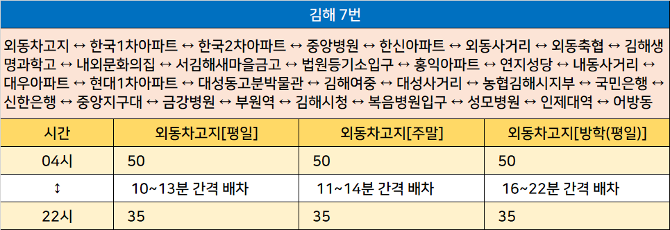 김해 7번: 외동차고지 ↔ 한국1차아파트 ↔ 한국2차아파트 ↔ 중앙병원 ↔ 한신아파트 ↔ 외동사거리 ↔ 외동축협 ↔ 김해생명과학고 ↔ 내외문화의집 ↔ 서김해새마을금고 ↔ 법원등기소입구 ↔ 홍익아파트 ↔ 연지성당 ↔ 내동사거리 ↔ 대우아파트 ↔ 현대1차아파트 ↔ 대성동고분박물관 ↔ 김해여중 ↔ 대성사거리 ↔ 농협김해시지부 ↔ 국민은행 ↔ 신한은행 ↔ 중앙지구대 ↔ 금강병원 ↔ 부원역 ↔ 김해시청 ↔ 복음병원입구 ↔ 성모병원 ↔ 인제대역 ↔ 어방동