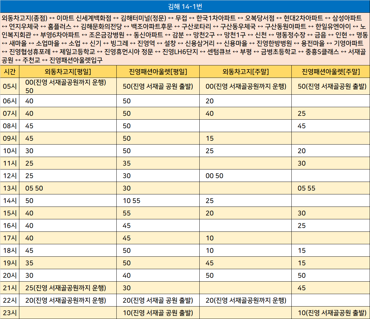 김해 14-1번: 외동차고지(종점) ↔ 이마트 신세계백화점 ↔ 김해터미널(정문) ↔ 무접 ↔ 한국1차아파트 ↔ 오복당서점 ↔ 현대2차아파트 ↔ 삼성아파트 ↔ 연지우체국 ↔ 홈플러스 ↔ 김해문화의전당 ↔ 백조아파트후문 ↔ 구산로타리 ↔ 구산동우체국 ↔ 구산동원아파트 ↔ 한일유엔아이 ↔ 노인복지회관 ↔ 부영6차아파트 ↔ 조은금강병원 ↔ 동신아파트 ↔ 감분 ↔ 망천2구 ↔ 망천1구 ↔ 신천 ↔ 명동정수장 ↔ 금음 ↔ 인현 ↔ 명동 ↔ 새마을 ↔ 소업마을 ↔ 소업 ↔ 신기 ↔ 빙그레 ↔ 진영역 ↔ 설창 ↔ 신용삼거리 ↔ 신용마을 ↔ 진영한방병원 ↔ 용전마을 ↔ 기영아파트 ↔ 진영협성휴포레 ↔ 제일고등학교 ↔ 진영휴먼시아 정문 ↔ 진영LH6단지 ↔ 센텀큐브 ↔ 부평 ↔ 금병초등학교 ↔ 중흥S클래스 ↔ 서재골공원 ↔ 주천교 ↔ 진영패션아울렛입구