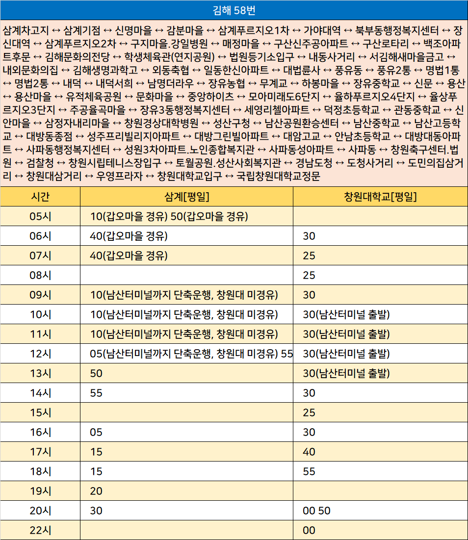 김해 58번: 삼계차고지 ↔ 삼계기점 ↔ 신명마을 ↔ 감분마을 ↔ 삼계푸르지오1차 ↔ 가야대역 ↔ 북부동행정복지센터 ↔ 장신대역 ↔ 삼계푸르지오2차 ↔ 구지마을.강일병원 ↔ 매정마을 ↔ 구산신주공아파트 ↔ 구산로타리 ↔ 백조아파트후문 ↔ 김해문화의전당 ↔ 학생체육관(연지공원) ↔ 법원등기소입구 ↔ 내동사거리 ↔ 서김해새마을금고 ↔ 내외문화의집 ↔ 김해생명과학고 ↔ 외동축협 ↔ 일동한신아파트 ↔ 대법륜사 ↔ 풍유동 ↔ 풍유2통 ↔ 명법1통 ↔ 명법2통 ↔ 내덕 ↔ 내덕서희 ↔ 남명더라우 ↔ 장유농협 ↔ 무계교 ↔ 하봉마을 ↔ 장유중학교 ↔ 신문 ↔ 용산 ↔ 용산마을 ↔ 유적체육공원 ↔ 문화마을 ↔ 중앙하이츠 ↔ 모아미래도6단지 ↔ 율하푸르지오4단지 ↔ 율상푸르지오3단지 ↔ 주공율곡마을 ↔ 장유3동행정복지센터 ↔ 세영리첼아파트 ↔ 덕정초등학교 ↔ 관동중학교 ↔ 신안마을 ↔ 삼정자내리마을 ↔ 창원경상대학병원 ↔ 성산구청 ↔ 남산공원환승센터 ↔ 남산중학교 ↔ 남산고등학교 ↔ 대방동종점 ↔ 성주프리빌리지아파트 ↔ 대방그린빌아파트 ↔ 대암고교 ↔ 안남초등학교 ↔ 대방대동아파트 ↔ 사파동행정복지센터 ↔ 성원3차아파트.노인종합복지관 ↔ 사파동성아파트 ↔ 사파동 ↔ 창원축구센터.법원 ↔ 검찰청 ↔ 창원시립테니스장입구 ↔ 토월공원.성산사회복지관 ↔ 경남도청 ↔ 도청사거리 ↔ 도민의집삼거리 ↔ 창원대삼거리 ↔ 우영프라자 ↔ 창원대학교입구 ↔ 국립창원대학교정문
