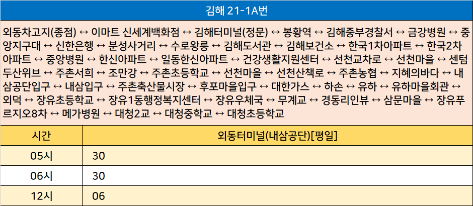 김해 21-1A번: 외동차고지(종점) ↔ 이마트 신세계백화점 ↔ 김해터미널(정문) ↔ 봉황역 ↔ 김해중부경찰서 ↔ 금강병원 ↔ 중앙지구대 ↔ 신한은행 ↔ 분성사거리 ↔ 수로왕릉 ↔ 김해도서관 ↔ 김해보건소 ↔ 한국1차아파트 ↔ 한국2차아파트 ↔ 중앙병원 ↔ 한신아파트 ↔ 일동한신아파트 ↔ 건강생활지원센터 ↔ 선천교차로 ↔ 선천마을 ↔ 센텀두산위브 ↔ 주촌서희 ↔ 조만강 ↔ 주촌초등학교 ↔ 선천마을 ↔ 선천산책로 ↔ 주촌농협 ↔ 지혜의바다 ↔ 내삼공단입구 ↔ 내삼입구 ↔ 주촌축산물시장 ↔ 후포마을입구 ↔ 대한가스 ↔ 하손 ↔ 유하 ↔ 유하마을회관 ↔ 외덕 ↔ 장유초등학교 ↔ 장유1동행정복지센터 ↔ 장유우체국 ↔ 무계교 ↔ 경동리인뷰 ↔ 삼문마을 ↔ 장유푸르지오8차 ↔ 메가병원 ↔ 대청2교 ↔ 대청중학교 ↔ 대청초등학교