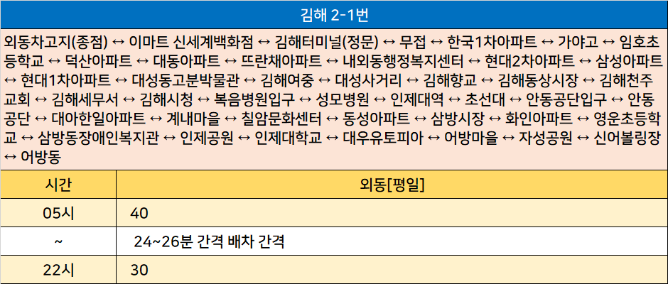김해 2-1번: 외동차고지(종점) ↔ 이마트 신세계백화점 ↔ 김해터미널(정문) ↔ 무접 ↔ 한국1차아파트 ↔ 가야고 ↔ 임호초등학교 ↔ 덕산아파트 ↔ 대동아파트 ↔ 뜨란채아파트 ↔ 내외동행정복지센터 ↔ 현대2차아파트 ↔ 삼성아파트 ↔ 현대1차아파트 ↔ 대성동고분박물관 ↔ 김해여중 ↔ 대성사거리 ↔ 김해향교 ↔ 김해동상시장 ↔ 김해천주교회 ↔ 김해세무서 ↔ 김해시청 ↔ 복음병원입구 ↔ 성모병원 ↔ 인제대역 ↔ 초선대 ↔ 안동공단입구 ↔ 안동공단 ↔ 대아한일아파트 ↔ 계내마을 ↔ 칠암문화센터 ↔ 동성아파트 ↔ 삼방시장 ↔ 화인아파트 ↔ 영운초등학교 ↔ 삼방동장애인복지관 ↔ 인제공원 ↔ 인제대학교 ↔ 대우유토피아 ↔ 어방마을 ↔ 자성공원 ↔ 신어볼링장 ↔ 어방동