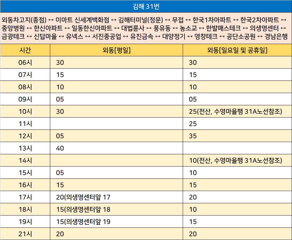 김해 31A번: 외동차고지(종점) ↔ 이마트 신세계백화점 ↔ 김해터미널(정문) ↔ 봉황역 ↔ 김해중부경찰서 ↔ 부원역 ↔ 전산마을 ↔ 활천46통(수영)