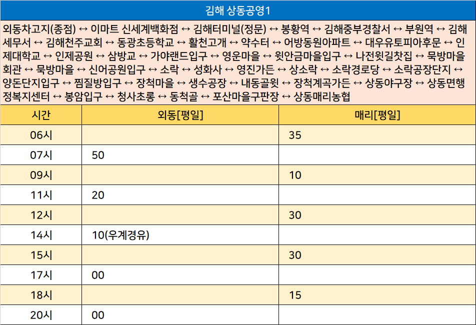 김해 상동공영1: 외동차고지(종점) ↔ 이마트 신세계백화점 ↔ 김해터미널(정문) ↔ 봉황역 ↔ 김해중부경찰서 ↔ 부원역 ↔ 김해세무서 ↔ 김해천주교회 ↔ 동광초등학교 ↔ 활천고개 ↔ 약수터 ↔ 어방동원아파트 ↔ 대우유토피아후문 ↔ 인제대학교 ↔ 인제공원 ↔ 삼방교 ↔ 가야랜드입구 ↔ 영운마을 ↔ 윗안금마을입구 ↔ 나전윗길찻집 ↔ 묵방마을회관 ↔ 묵방마을 ↔ 신어공원입구 ↔ 소락 ↔ 성화사 ↔ 영진가든 ↔ 상소락 ↔ 소락경로당 ↔ 소락공장단지 ↔ 양돈단지입구 ↔ 찜질방입구 ↔ 장척마을 ↔ 생수공장 ↔ 내동골윗 ↔ 장척계곡가든 ↔ 상동야구장 ↔ 상동면행정복지센터 ↔ 봉암입구 ↔ 청사초롱 ↔ 동척골 ↔ 포산마을구판장 ↔ 상동매리농협