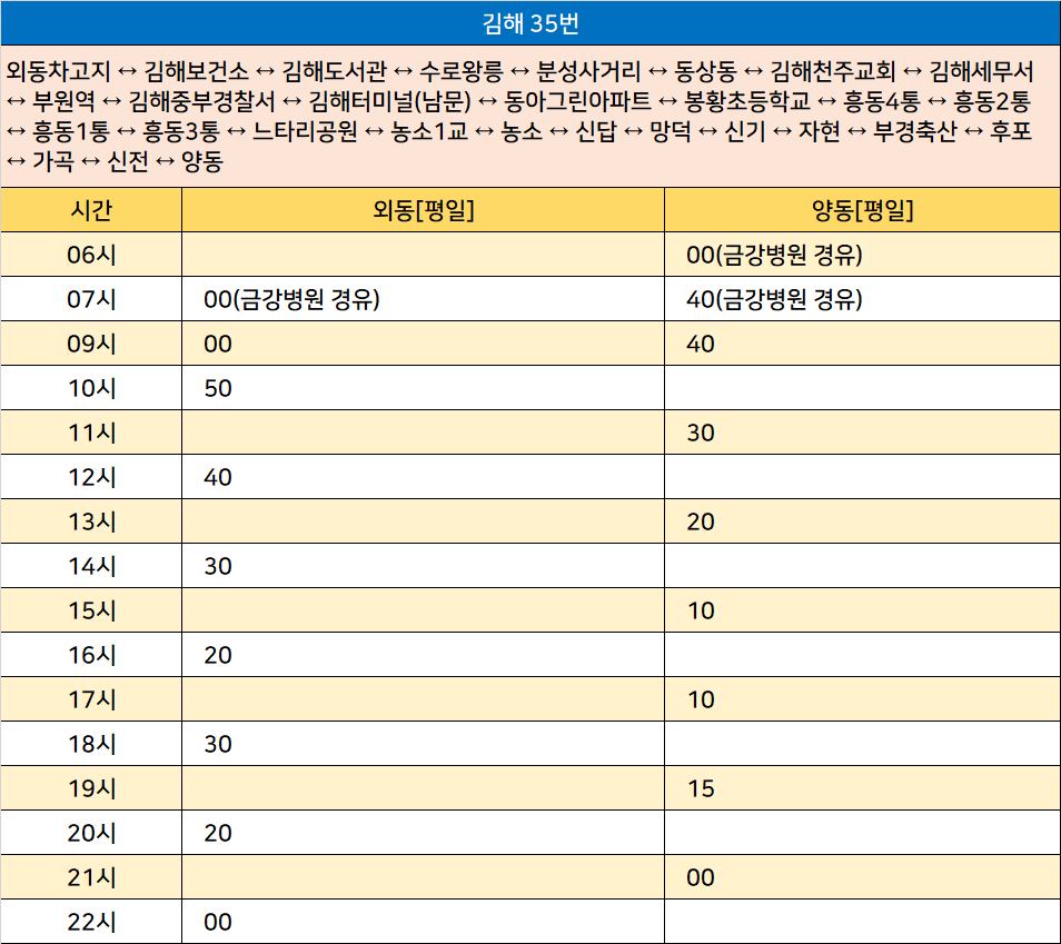 김해 35번: 외동차고지 ↔ 김해보건소 ↔ 김해도서관 ↔ 수로왕릉 ↔ 분성사거리 ↔ 동상동 ↔ 김해천주교회 ↔ 김해세무서 ↔ 부원역 ↔ 김해중부경찰서 ↔ 김해터미널(남문) ↔ 동아그린아파트 ↔ 봉황초등학교 ↔ 흥동4통 ↔ 흥동2통 ↔ 흥동1통 ↔ 흥동3통 ↔ 느타리공원 ↔ 농소1교 ↔ 농소 ↔ 신답 ↔ 망덕 ↔ 신기 ↔ 자현 ↔ 부경축산 ↔ 후포 ↔ 가곡 ↔ 신전 ↔ 양동