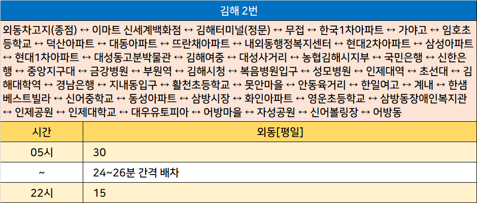 김해 2번: 외동차고지(종점) ↔ 이마트 신세계백화점 ↔ 김해터미널(정문) ↔ 무접 ↔ 한국1차아파트 ↔ 가야고 ↔ 임호초등학교 ↔ 덕산아파트 ↔ 대동아파트 ↔ 뜨란채아파트 ↔ 내외동행정복지센터 ↔ 현대2차아파트 ↔ 삼성아파트 ↔ 현대1차아파트 ↔ 대성동고분박물관 ↔ 김해여중 ↔ 대성사거리 ↔ 농협김해시지부 ↔ 국민은행 ↔ 신한은행 ↔ 중앙지구대 ↔ 금강병원 ↔ 부원역 ↔ 김해시청 ↔ 복음병원입구 ↔ 성모병원 ↔ 인제대역 ↔ 초선대 ↔ 김해대학역 ↔ 경남은행 ↔ 지내동입구 ↔ 활천초등학교 ↔ 못안마을 ↔ 안동육거리 ↔ 한일여고 ↔ 계내 ↔ 한샘베스트빌라 ↔ 신어중학교 ↔ 동성아파트 ↔ 삼방시장 ↔ 화인아파트 ↔ 영운초등학교 ↔ 삼방동장애인복지관 ↔ 인제공원 ↔ 인제대학교 ↔ 대우유토피아 ↔ 어방마을 ↔ 자성공원 ↔ 신어볼링장 ↔ 어방동