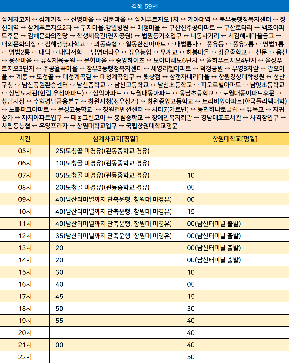 김해 59번: 삼계차고지 ↔ 삼계기점 ↔ 신명마을 ↔ 감분마을 ↔ 삼계푸르지오1차 ↔ 가야대역 ↔ 북부동행정복지센터 ↔ 장신대역 ↔ 삼계푸르지오2차 ↔ 구지마을.강일병원 ↔ 매정마을 ↔ 구산신주공아파트 ↔ 구산로타리 ↔ 백조아파트후문 ↔ 김해문화의전당 ↔ 학생체육관(연지공원) ↔ 법원등기소입구 ↔ 내동사거리 ↔ 서김해새마을금고 ↔ 내외문화의집 ↔ 김해생명과학고 ↔ 외동축협 ↔ 일동한신아파트 ↔ 대법륜사 ↔ 풍유동 ↔ 풍유2통 ↔ 명법1통 ↔ 명법2통 ↔ 내덕 ↔ 내덕서희 ↔ 남명더라우 ↔ 장유농협 ↔ 무계교 ↔ 하봉마을 ↔ 장유중학교 ↔ 신문 ↔ 용산 ↔ 용산마을 ↔ 유적체육공원 ↔ 문화마을 ↔ 중앙하이츠 ↔ 모아미래도6단지 ↔ 율하푸르지오4단지 ↔ 율상푸르지오3단지 ↔ 주공율곡마을 ↔ 장유3동행정복지센터 ↔ 세영리첼아파트 ↔ 덕정공원 ↔ 부영8차앞 ↔ 갑오마을 ↔ 계동 ↔ 도청골 ↔ 대청계곡길 ↔ 대청계곡입구 ↔ 윗상점 ↔ 삼정자내리마을 ↔ 창원경상대학병원 ↔ 성산구청 ↔ 남산공원환승센터 ↔ 남산중학교 ↔ 남산고등학교 ↔ 남산초등학교 ↔ 피오르빌아파트 ↔ 남양초등학교 ↔ 상남도서관(한림.우성아파트) ↔ 삼익아파트 ↔ 토월대동아파트 ↔ 웅남초등학교 ↔ 토월대동아파트후문 ↔ 상남시장 ↔ 수협경남금융본부 ↔ 창원시청(정우상가) ↔ 창원중앙고등학교 ↔ 트리비앙아파트(한국폴리텍대학) ↔ 노블파크아파트 ↔ 문성고등학교 ↔ 창원컨벤션센터 ↔ 시티7(가로변) ↔ 농협하나로클럽 ↔ 유목교 ↔ 지귀상가 ↔ 까치아파트입구 ↔ 대동그린코아 ↔ 봉림중학교 ↔ 장애인복지회관 ↔ 경남대표도서관 ↔ 사격장입구 ↔ 사림동농협 ↔ 우영프라자 ↔ 창원대학교입구 ↔ 국립창원대학교정문