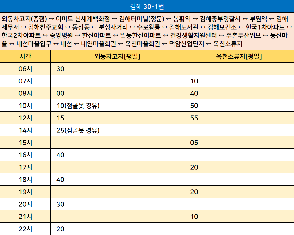 김해 30-1번: 외동차고지(종점) ↔ 이마트 신세계백화점 ↔ 김해터미널(정문) ↔ 봉황역 ↔ 김해중부경찰서 ↔ 부원역 ↔ 김해세무서 ↔ 김해천주교회 ↔ 동상동 ↔ 분성사거리 ↔ 수로왕릉 ↔ 김해도서관 ↔ 김해보건소 ↔ 한국1차아파트 ↔ 한국2차아파트 ↔ 중앙병원 ↔ 한신아파트 ↔ 일동한신아파트 ↔ 건강생활지원센터 ↔ 주촌두산위브 ↔ 동선마을 ↔ 내선마을입구 ↔ 내선 ↔ 내연마을회관 ↔ 옥천마을회관 ↔ 덕암산업단지 ↔ 옥천소류지