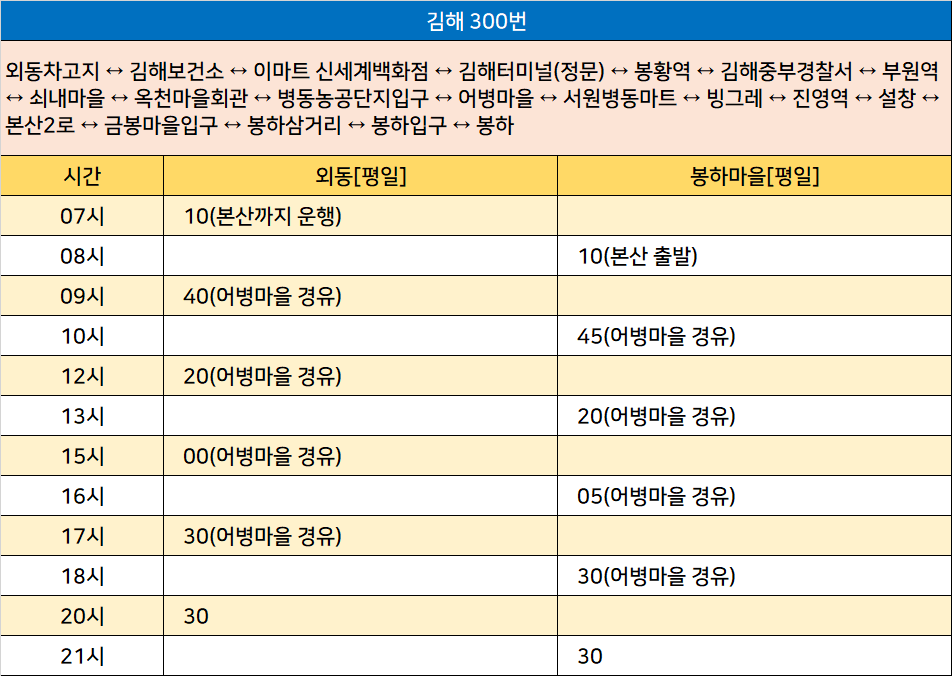 김해 300번: 외동차고지 ↔ 김해보건소 ↔ 이마트 신세계백화점 ↔ 김해터미널(정문) ↔ 봉황역 ↔ 김해중부경찰서 ↔ 부원역 ↔ 쇠내마을 ↔ 옥천마을회관 ↔ 병동농공단지입구 ↔ 어병마을 ↔ 서원병동마트 ↔ 빙그레 ↔ 진영역 ↔ 설창 ↔ 본산2로 ↔ 금봉마을입구 ↔ 봉하삼거리 ↔ 봉하입구 ↔ 봉하