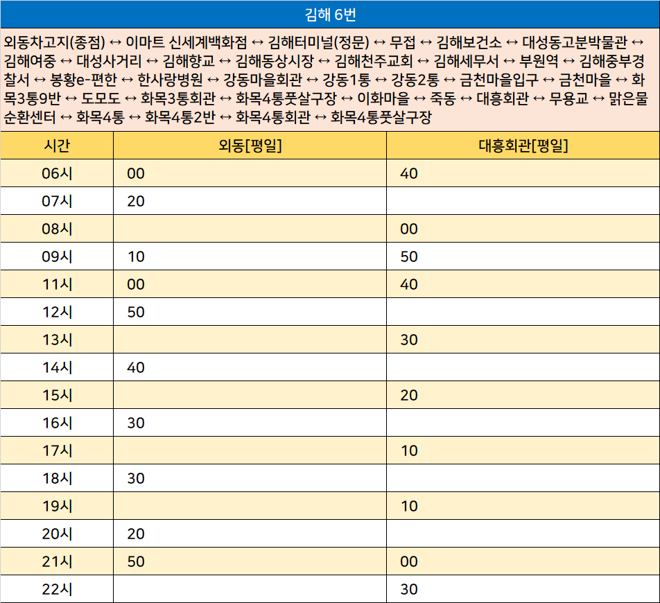 김해 6번: 외동차고지(종점) ↔ 이마트 신세계백화점 ↔ 김해터미널(정문) ↔ 무접 ↔ 김해보건소 ↔ 대성동고분박물관 ↔ 김해여중 ↔ 대성사거리 ↔ 김해향교 ↔ 김해동상시장 ↔ 김해천주교회 ↔ 김해세무서 ↔ 부원역 ↔ 김해중부경찰서 ↔ 봉황e-편한 ↔ 한사랑병원 ↔ 강동마을회관 ↔ 강동1통 ↔ 강동2통 ↔ 금천마을입구 ↔ 금천마을 ↔ 화목3통9반 ↔ 도모도 ↔ 화목3통회관 ↔ 화목4통풋살구장 ↔ 이화마을 ↔ 죽동 ↔ 대흥회관 ↔ 무용교 ↔ 맑은물순환센터 ↔ 화목4통 ↔ 화목4통2반 ↔ 화목4통회관 ↔ 화목4통풋살구장