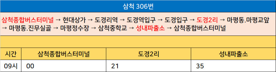 삼척 306번: 삼척종합버스터미널 → 현대상가 → 도경리역 → 도경역입구 → 도경입구 → 도경2리 → 마평동.마평교앞 → 마평동.진무실골 → 마평정수장 → 삼척중학교 → 성내파출소 → 삼척종합버스터미널