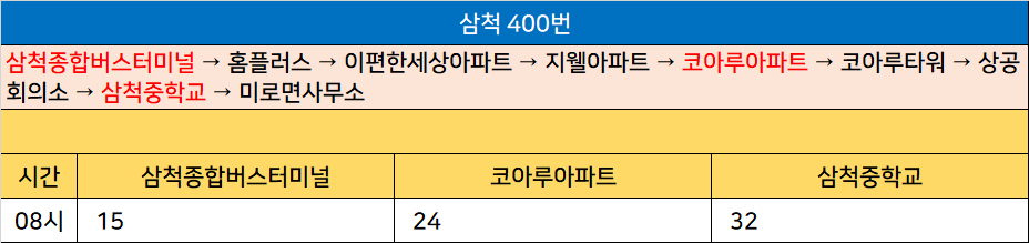 삼척 400번: 삼척종합버스터미널 → 홈플러스 → 이편한세상아파트 → 지웰아파트 → 코아루아파트 → 코아루타워 → 상공회의소 → 삼척중학교 → 미로면사무소