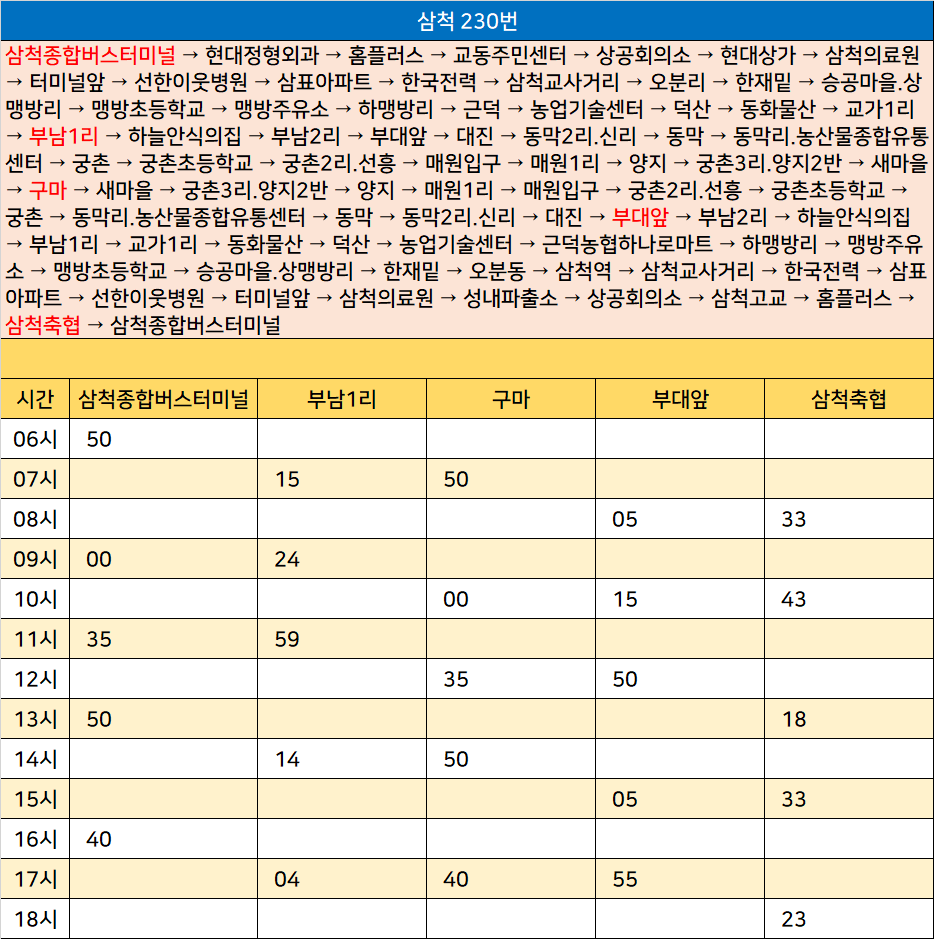 삼척 230번: 삼척종합버스터미널 → 현대정형외과 → 홈플러스 → 교동주민센터 → 상공회의소 → 현대상가 → 삼척의료원 → 터미널앞 → 선한이웃병원 → 삼표아파트 → 한국전력 → 삼척교사거리 → 오분리 → 한재밑 → 승공마을.상맹방리 → 맹방초등학교 → 맹방주유소 → 하맹방리 → 근덕 → 농업기술센터 → 덕산 → 동화물산 → 교가1리 → 부남1리 → 하늘안식의집 → 부남2리 → 부대앞 → 대진 → 동막2리.신리 → 동막 → 동막리.농산물종합유통센터 → 궁촌 → 궁촌초등학교 → 궁촌2리.선흥 → 매원입구 → 매원1리 → 양지 → 궁촌3리.양지2반 → 새마을 → 구마 → 새마을 → 궁촌3리.양지2반 → 양지 → 매원1리 → 매원입구 → 궁촌2리.선흥 → 궁촌초등학교 → 궁촌 → 동막리.농산물종합유통센터 → 동막 → 동막2리.신리 → 대진 → 부대앞 → 부남2리 → 하늘안식의집 → 부남1리 → 교가1리 → 동화물산 → 덕산 → 농업기술센터 → 근덕농협하나로마트 → 하맹방리 → 맹방주유소 → 맹방초등학교 → 승공마을.상맹방리 → 한재밑 → 오분동 → 삼척역 → 삼척교사거리 → 한국전력 → 삼표아파트 → 선한이웃병원 → 터미널앞 → 삼척의료원 → 성내파출소 → 상공회의소 → 삼척고교 → 홈플러스 → 삼척축협 → 삼척종합버스터미널