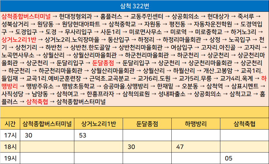 삼척 322번: 삼척종합버스터미널 → 현대정형외과 → 홈플러스 → 교동주민센터 → 상공회의소 → 현대상가 → 죽서루 → 성북삼거리 → 원당동 → 원당현대아파트 → 삼척중학교 → 자원동 → 평전동 → 자동차운전학원 → 도경역입구 → 도경입구 → 도경 → 무사리입구 → 사둔1리 → 미로면사무소 → 미로역 → 미로중학교 → 하거노3리 → 상거노2리1반 → 상거노2리.노익장마을 → 동산입구 → 하정리 → 하정리마을회관 → 상정 → 노곡입구 → 천기 → 상천기리 → 하반천 → 상반천.한도골앞 → 상반천리마을회관 → 여삼입구 → 고자리.아진골 → 고자리 → 노곡면사무소 → 상월산리 → 상월산리마을회관 → 하군천리마을회관 → 하군천리 → 상군천리 → 상군천리마을회관 → 상군천리 → 둔달리입구 → 둔달종점 → 둔달리입구 → 상군천리 → 상군천리마을회관 → 상군천리 → 하군천리 → 하군천리마을회관 → 상월산리마을회관 → 상월산리 → 하월산리 → 개산.고봉암 → 교곡1리.들입재 → 교곡1리.예비군훈련장 → 근덕초.교곡분교 → 교가6리.도원 → 교가5리.무릉 → 교가4리.옥계 → 하맹방리 → 맹방주유소 → 맹방초등학교 → 승공마을.상맹방리 → 한재밑 → 오분동 → 삼척역 → 삼표시멘트 → 사직성당 → 남양동 → 삼척여고 → 한흥프라자 → 삼척의료원 → 성내파출소 → 상공회의소 → 삼척고교 → 홈플러스 → 삼척축협 → 삼척종합버스터미널