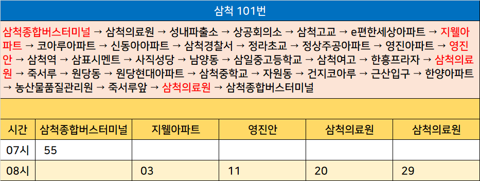 삼척 101번: 삼척종합버스터미널 → 삼척의료원 → 성내파출소 → 상공회의소 → 삼척고교 → e편한세상아파트 → 지웰아파트 → 코아루아파트 → 신동아아파트 → 삼척경찰서 → 정라초교 → 정상주공아파트 → 영진아파트 → 영진안 → 삼척역 → 삼표시멘트 → 사직성당 → 남양동 → 삼일중고등학교 → 삼척여고 → 한흥프라자 → 삼척의료원 → 죽서루 → 원당동 → 원당현대아파트 → 삼척중학교 → 자원동 → 건지코아루 → 근산입구 → 한양아파트 → 농산물품질관리원 → 죽서루앞 → 삼척의료원 → 삼척종합버스터미널
