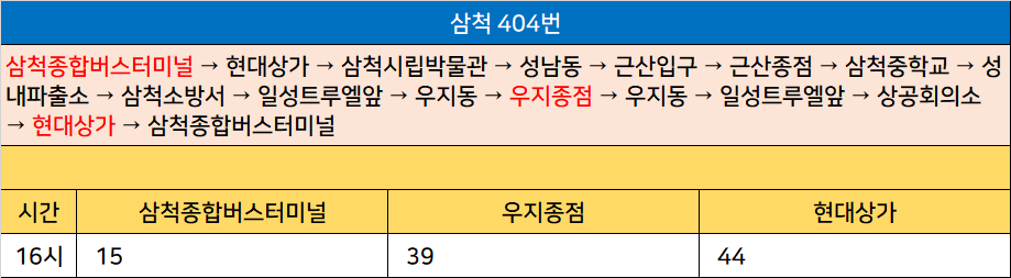 삼척 404번: 삼척종합버스터미널 → 현대상가 → 삼척시립박물관 → 성남동 → 근산입구 → 근산종점 → 삼척중학교 → 성내파출소 → 삼척소방서 → 일성트루엘앞 → 우지동 → 우지종점 → 우지동 → 일성트루엘앞 → 상공회의소 → 현대상가 → 삼척종합버스터미널