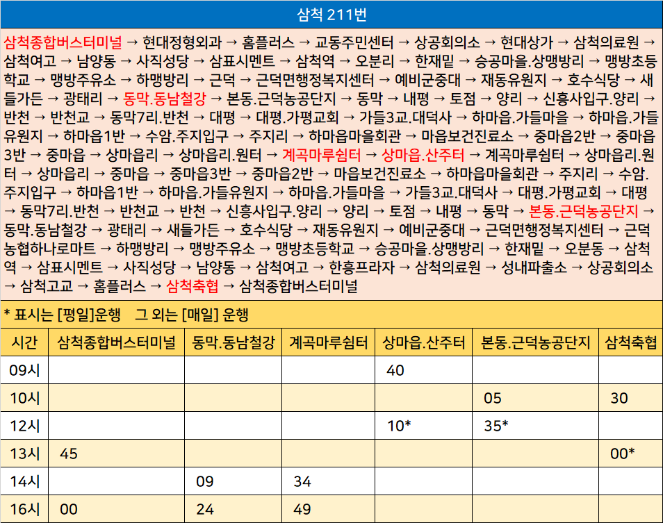 삼척 211번: 삼척종합버스터미널 → 현대정형외과 → 홈플러스 → 교동주민센터 → 상공회의소 → 현대상가 → 삼척의료원 → 삼척여고 → 남양동 → 사직성당 → 삼표시멘트 → 삼척역 → 오분리 → 한재밑 → 승공마을.상맹방리 → 맹방초등학교 → 맹방주유소 → 하맹방리 → 근덕 → 근덕면행정복지센터 → 예비군중대 → 재동유원지 → 호수식당 → 새들가든 → 광태리 → 동막.동남철강 → 본동.근덕농공단지 → 동막 → 내평 → 토점 → 양리 → 신흥사입구.양리 → 반천 → 반천교 → 동막7리.반천 → 대평 → 대평.가평교회 → 가들3교.대덕사 → 하마읍.가들마을 → 하마읍.가들유원지 → 하마읍1반 → 수암.주지입구 → 주지리 → 하마읍마을회관 → 마읍보건진료소 → 중마읍2반 → 중마읍3반 → 중마읍 → 상마읍리 → 상마읍리.원터 → 계곡마루쉼터 → 상마읍.산주터 → 계곡마루쉼터 → 상마읍리.원터 → 상마읍리 → 중마읍 → 중마읍3반 → 중마읍2반 → 마읍보건진료소 → 하마읍마을회관 → 주지리 → 수암.주지입구 → 하마읍1반 → 하마읍.가들유원지 → 하마읍.가들마을 → 가들3교.대덕사 → 대평.가평교회 → 대평 → 동막7리.반천 → 반천교 → 반천 → 신흥사입구.양리 → 양리 → 토점 → 내평 → 동막 → 본동.근덕농공단지 → 동막.동남철강 → 광태리 → 새들가든 → 호수식당 → 재동유원지 → 예비군중대 → 근덕면행정복지센터 → 근덕농협하나로마트 → 하맹방리 → 맹방주유소 → 맹방초등학교 → 승공마을.상맹방리 → 한재밑 → 오분동 → 삼척역 → 삼표시멘트 → 사직성당 → 남양동 → 삼척여고 → 한흥프라자 → 삼척의료원 → 성내파출소 → 상공회의소 → 삼척고교 → 홈플러스 → 삼척축협 → 삼척종합버스터미널