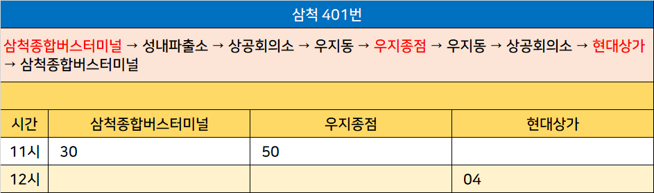 삼척 401번: 삼척종합버스터미널 → 성내파출소 → 상공회의소 → 우지동 → 우지종점 → 우지동 → 상공회의소 → 현대상가 → 삼척종합버스터미널