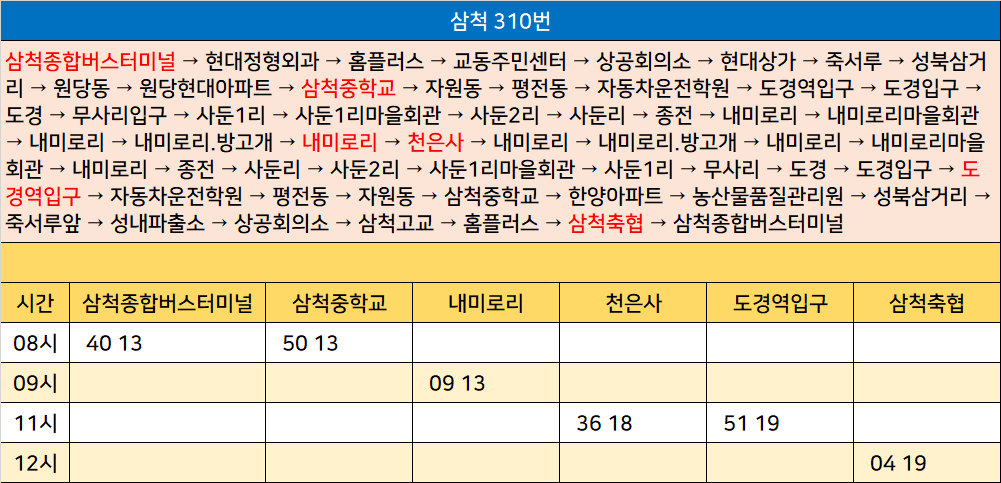 삼척 310번: 삼척종합버스터미널 → 현대정형외과 → 홈플러스 → 교동주민센터 → 상공회의소 → 현대상가 → 죽서루 → 성북삼거리 → 원당동 → 원당현대아파트 → 삼척중학교 → 자원동 → 평전동 → 자동차운전학원 → 도경역입구 → 도경입구 → 도경 → 무사리입구 → 사둔1리 → 사둔1리마을회관 → 사둔2리 → 사둔리 → 종전 → 내미로리 → 내미로리마을회관 → 내미로리 → 내미로리.방고개 → 내미로리 → 천은사 → 내미로리 → 내미로리.방고개 → 내미로리 → 내미로리마을회관 → 내미로리 → 종전 → 사둔리 → 사둔2리 → 사둔1리마을회관 → 사둔1리 → 무사리 → 도경 → 도경입구 → 도경역입구 → 자동차운전학원 → 평전동 → 자원동 → 삼척중학교 → 한양아파트 → 농산물품질관리원 → 성북삼거리 → 죽서루앞 → 성내파출소 → 상공회의소 → 삼척고교 → 홈플러스 → 삼척축협 → 삼척종합버스터미널