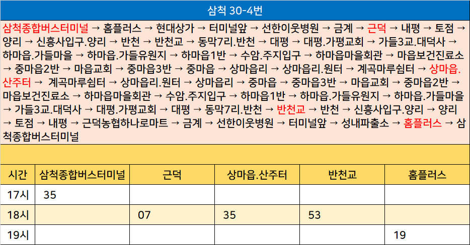 삼척 30-4번: 삼척종합버스터미널 → 홈플러스 → 현대상가 → 터미널앞 → 선한이웃병원 → 금계 → 근덕 → 내평 → 토점 → 양리 → 신흥사입구.양리 → 반천 → 반천교 → 동막7리.반천 → 대평 → 대평.가평교회 → 가들3교.대덕사 → 하마읍.가들마을 → 하마읍.가들유원지 → 하마읍1반 → 수암.주지입구 → 하마읍마을회관 → 마읍보건진료소 → 중마읍2반 → 마읍교회 → 중마읍3반 → 중마읍 → 상마읍리 → 상마읍리.원터 → 계곡마루쉼터 → 상마읍.산주터 → 계곡마루쉼터 → 상마읍리.원터 → 상마읍리 → 중마읍 → 중마읍3반 → 마읍교회 → 중마읍2반 → 마읍보건진료소 → 하마읍마을회관 → 수암.주지입구 → 하마읍1반 → 하마읍.가들유원지 → 하마읍.가들마을 → 가들3교.대덕사 → 대평.가평교회 → 대평 → 동막7리.반천 → 반천교 → 반천 → 신흥사입구.양리 → 양리 → 토점 → 내평 → 근덕농협하나로마트 → 금계 → 선한이웃병원 → 터미널앞 → 성내파출소 → 홈플러스 → 삼척종합버스터미널