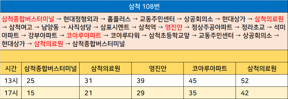 삼척 108번: 삼척종합버스터미널 → 현대정형외과 → 홈플러스 → 교동주민센터 → 상공회의소 → 현대상가 → 삼척의료원 → 삼척여고 → 남양동 → 사직성당 → 삼표시멘트 → 삼척역 → 영진안 → 정상주공아파트 → 정라초교 → 석미아파트 → 강부아파트 → 코아루아파트 → 코아루타워 → 삼척초등학교앞 → 교동주민센터 → 상공회의소 → 현대상가 → 삼척의료원 → 삼척종합버스터미널