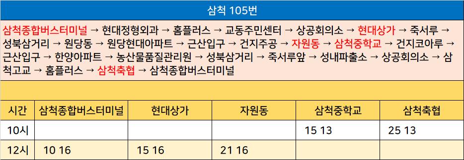 삼척 105번: 삼척종합버스터미널 → 현대정형외과 → 홈플러스 → 교동주민센터 → 상공회의소 → 현대상가 → 죽서루 → 성북삼거리 → 원당동 → 원당현대아파트 → 근산입구 → 건지주공 → 자원동 → 삼척중학교 → 건지코아루 → 근산입구 → 한양아파트 → 농산물품질관리원 → 성북삼거리 → 죽서루앞 → 성내파출소 → 상공회의소 → 삼척고교 → 홈플러스 → 삼척축협 → 삼척종합버스터미널