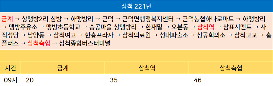 삼척 221번: 금계 → 상맹방2리.심방 → 하맹방리 → 근덕 → 근덕면행정복지센터 → 근덕농협하나로마트 → 하맹방리 → 맹방주유소 → 맹방초등학교 → 승공마을.상맹방리 → 한재밑 → 오분동 → 삼척역 → 삼표시멘트 → 사직성당 → 남양동 → 삼척여고 → 한흥프라자 → 삼척의료원 → 성내파출소 → 상공회의소 → 삼척고교 → 홈플러스 → 삼척축협 → 삼척종합버스터미널
