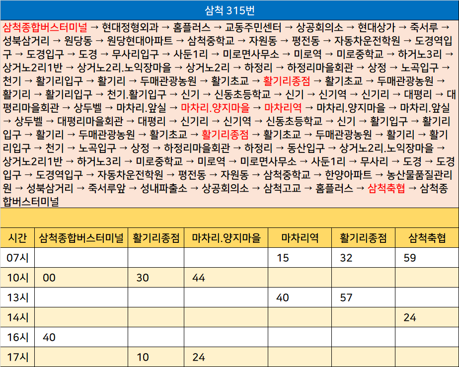 삼척 315번: 삼척종합버스터미널 → 현대정형외과 → 홈플러스 → 교동주민센터 → 상공회의소 → 현대상가 → 죽서루 → 성북삼거리 → 원당동 → 원당현대아파트 → 삼척중학교 → 자원동 → 평전동 → 자동차운전학원 → 도경역입구 → 도경입구 → 도경 → 무사리입구 → 사둔1리 → 미로면사무소 → 미로역 → 미로중학교 → 하거노3리 → 상거노2리1반 → 상거노2리.노익장마을 → 상거노2리 → 하정리 → 하정리마을회관 → 상정 → 노곡입구 → 천기 → 활기리입구 → 활기리 → 두매관광농원 → 활기초교 → 활기리종점 → 활기초교 → 두매관광농원 → 활기리 → 활기리입구 → 천기.활기입구 → 신기 → 신동초등학교 → 신기 → 신기역 → 신기리 → 대평리 → 대평리마을회관 → 상두벨 → 마차리.앞실 → 마차리.양지마을 → 마차리역 → 마차리.양지마을 → 마차리.앞실 → 상두벨 → 대평리마을회관 → 대평리 → 신기리 → 신기역 → 신동초등학교 → 신기 → 활기입구 → 활기리입구 → 활기리 → 두매관광농원 → 활기초교 → 활기리종점 → 활기초교 → 두매관광농원 → 활기리 → 활기리입구 → 천기 → 노곡입구 → 상정 → 하정리마을회관 → 하정리 → 동산입구 → 상거노2리.노익장마을 → 상거노2리1반 → 하거노3리 → 미로중학교 → 미로역 → 미로면사무소 → 사둔1리 → 무사리 → 도경 → 도경입구 → 도경역입구 → 자동차운전학원 → 평전동 → 자원동 → 삼척중학교 → 한양아파트 → 농산물품질관리원 → 성북삼거리 → 죽서루앞 → 성내파출소 → 상공회의소 → 삼척고교 → 홈플러스 → 삼척축협 → 삼척종합버스터미널