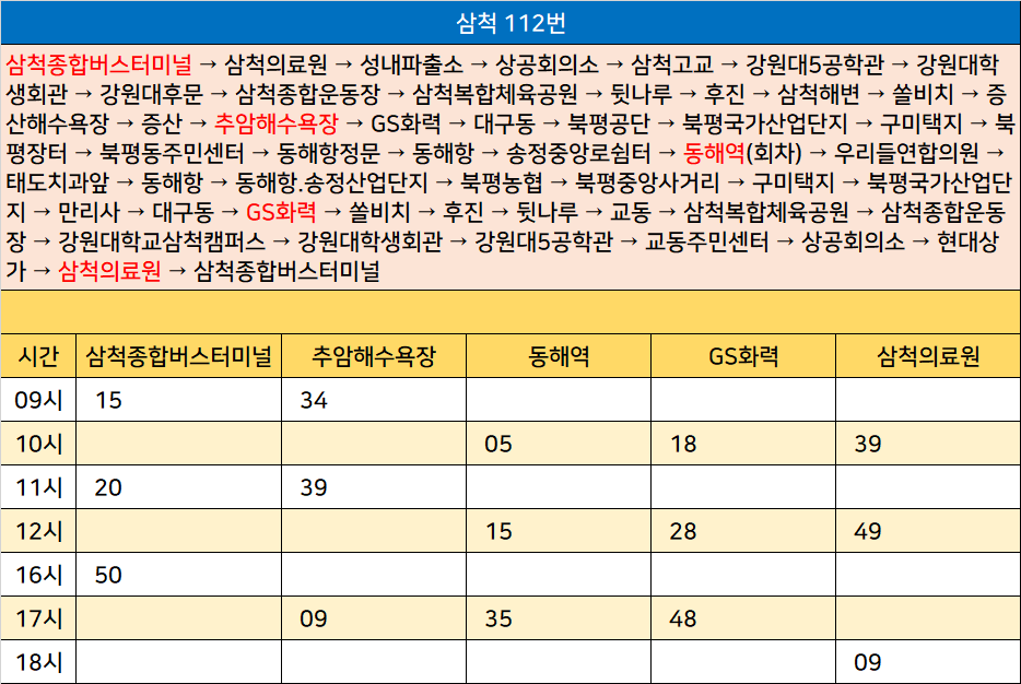 삼척 112번: 삼척종합버스터미널 → 삼척의료원 → 성내파출소 → 상공회의소 → 삼척고교 → 강원대5공학관 → 강원대학생회관 → 강원대후문 → 삼척종합운동장 → 삼척복합체육공원 → 뒷나루 → 후진 → 삼척해변 → 쏠비치 → 증산해수욕장 → 증산 → 추암해수욕장 → GS화력 → 대구동 → 북평공단 → 북평국가산업단지 → 구미택지 → 북평장터 → 북평동주민센터 → 동해항정문 → 동해항 → 송정중앙로쉼터 → 동해역(회차) → 우리들연합의원 → 태도치과앞 → 동해항 → 동해항.송정산업단지 → 북평농협 → 북평중앙사거리 → 구미택지 → 북평국가산업단지 → 만리사 → 대구동 → GS화력 → 쏠비치 → 후진 → 뒷나루 → 교동 → 삼척복합체육공원 → 삼척종합운동장 → 강원대학교삼척캠퍼스 → 강원대학생회관 → 강원대5공학관 → 교동주민센터 → 상공회의소 → 현대상가 → 삼척의료원 → 삼척종합버스터미널