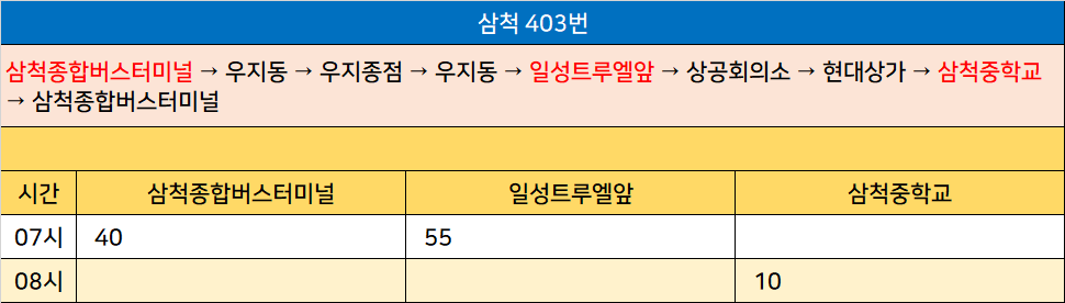 삼척 403번: 삼척종합버스터미널 → 우지동 → 우지종점 → 우지동 → 일성트루엘앞 → 상공회의소 → 현대상가 → 삼척중학교 → 삼척종합버스터미널