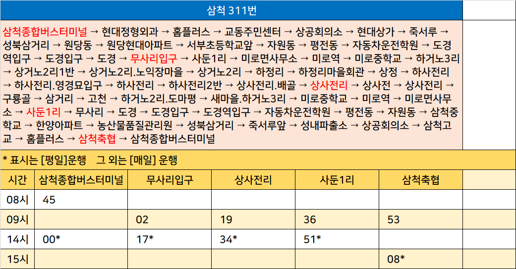 삼척 311번: 삼척종합버스터미널 → 현대정형외과 → 홈플러스 → 교동주민센터 → 상공회의소 → 현대상가 → 죽서루 → 성북삼거리 → 원당동 → 원당현대아파트 → 서부초등학교앞 → 자원동 → 평전동 → 자동차운전학원 → 도경역입구 → 도경입구 → 도경 → 무사리입구 → 사둔1리 → 미로면사무소 → 미로역 → 미로중학교 → 하거노3리 → 상거노2리1반 → 상거노2리.노익장마을 → 상거노2리 → 하정리 → 하정리마을회관 → 상정 → 하사전리 → 하사전리.영경묘입구 → 하사전리 → 하사전리2반 → 상사전리.배골 → 상사전리 → 상사전 → 상사전리 → 구룡골 → 삼거리 → 고천 → 하거노2리.도마평 → 새마을.하거노3리 → 미로중학교 → 미로역 → 미로면사무소 → 사둔1리 → 무사리 → 도경 → 도경입구 → 도경역입구 → 자동차운전학원 → 평전동 → 자원동 → 삼척중학교 → 한양아파트 → 농산물품질관리원 → 성북삼거리 → 죽서루앞 → 성내파출소 → 상공회의소 → 삼척고교 → 홈플러스 → 삼척축협 → 삼척종합버스터미널