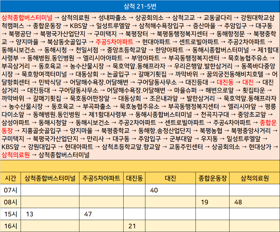 삼척 21-5번: 삼척종합버스터미널 → 삼척의료원 → 성내파출소 → 상공회의소 → 삼척고교 → 교동굴다리 → 강원대학교삼척캠퍼스 → 종합운동장 → KBS앞 → 일성트루엘앞 → 삼척해수욕장입구 → 증산마을 → 추암입구 → 대구동 → 북평공단 → 북평국가산업단지 → 구미택지 → 북평장터 → 북평동행정복지센터 → 동해항정문 → 북평중학교 → 양지마을 → 북삼동숫골입구 → 주공5차아파트 → 현대아파트 → 센트로빌아파트 → 주공2차아파트 → 동해시보건소 → 동해시청 → 천일서점 → 중앙초등학교앞 → 한양아파트 → 동해시종합버스터미널 → 제1함대사령부 → 동해병원.동인병원 → 엘리시아아파트 → 부영아파트 → 부곡동행정복지센터 → 묵호농협주유소 → 부곡삼거리 → 동호육교 → 농수산물시장 → 묵호역앞.동해프라자 → 우리은행앞.발한삼거리 → 동쪽바다중앙시장 → 묵호항여객터미널 → 대동상회 → 논골입구 → 갈매기횟집 → 까막바위 → 꿈의궁전동해비치호텔 → 어달항회센터 → 민박식당 → 어달해수욕장.어달해변 → 구어달동사무소 → 대진등대 → 대진동 → 대진 → 대진삼거리 → 대진등대 → 구어달동사무소 → 어달해수욕장.어달해변 → 마을슈퍼 → 해변으로앞 → 횟집타운 → 까막바위 → 갈매기횟집 → 묵호동어판장앞 → 대동상회 → 조은내과앞 → 발한삼거리 → 묵호역앞.동해프라자 → 농수산물시장 → 동호육교 → 부곡파출소 → 묵호농협주유소 → 부곡동행정복지센터 → 엘리시아앞 → 평릉다이소앞 → 동해병원.동인병원 → 제1함대사령부 → 동해시종합버스터미널 → 천곡지구대 → 중앙초교앞 → 삼성아파트 → 동해시청앞 → 동해시보건소 → 주공2차아파트 → 센트로빌아파트 → 주공4차아파트 → 종합운동장 → 지흥골숫골입구 → 양지마을 → 북평중학교 → 동해항.송정산업단지 → 북평농협 → 북평중앙사거리 → 구미택지 → 북평국가산업단지 → 만리사 → 대구동 → 추암입구 → 군부대앞 → 우지동 → 일성트루엘앞 → KBS앞 → 강원대입구 → 현대아파트 → 삼척초등학교앞.향교앞 → 교동주민센터 → 상공회의소 → 현대상가 → 삼척의료원 → 삼척종합버스터미널