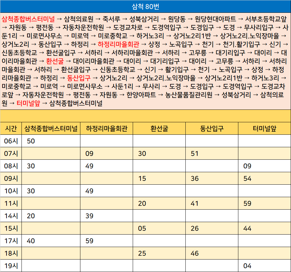 삼척 80번: 삼척종합버스터미널 → 삼척의료원 → 죽서루 → 성북삼거리 → 원당동 → 원당현대아파트 → 서부초등학교앞 → 자원동 → 평전동 → 자동차운전학원 → 도경교차로 → 도경역입구 → 도경입구 → 도경 → 무사리입구 → 사둔1리 → 미로면사무소 → 미로역 → 미로중학교 → 하거노3리 → 상거노2리1반 → 상거노2리.노익장마을 → 상거노2리 → 동산입구 → 하정리 → 하정리마을회관 → 상정 → 노곡입구 → 천기 → 천기.활기입구 → 신기 → 신동초등학교 → 환선굴입구 → 서하리 → 서하리마을회관 → 서하리 → 고무릉 → 대기리입구 → 대이리 → 대이리마을회관 → 환선굴 → 대이리마을회관 → 대이리 → 대기리입구 → 대이리 → 고무릉 → 서하리 → 서하리마을회관 → 서하리 → 환선굴입구 → 신동초등학교 → 신기 → 활기입구 → 천기 → 노곡입구 → 상정 → 하정리마을회관 → 하정리 → 동산입구 → 상거노2리 → 상거노2리.노익장마을 → 상거노2리1반 → 하거노3리 → 미로중학교 → 미로역 → 미로면사무소 → 사둔1리 → 무사리 → 도경 → 도경입구 → 도경역입구 → 도경교차로앞 → 자동차운전학원 → 평전동 → 자원동 → 한양아파트 → 농산물품질관리원 → 성북삼거리 → 삼척의료원 → 터미널앞 → 삼척종합버스터미널