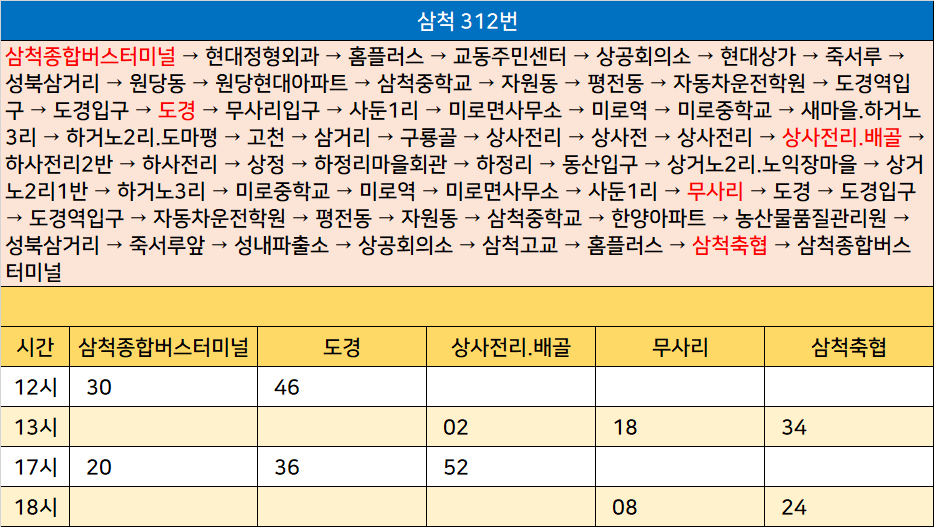 삼척 312번: 삼척종합버스터미널 → 현대정형외과 → 홈플러스 → 교동주민센터 → 상공회의소 → 현대상가 → 죽서루 → 성북삼거리 → 원당동 → 원당현대아파트 → 삼척중학교 → 자원동 → 평전동 → 자동차운전학원 → 도경역입구 → 도경입구 → 도경 → 무사리입구 → 사둔1리 → 미로면사무소 → 미로역 → 미로중학교 → 새마을.하거노3리 → 하거노2리.도마평 → 고천 → 삼거리 → 구룡골 → 상사전리 → 상사전 → 상사전리 → 상사전리.배골 → 하사전리2반 → 하사전리 → 상정 → 하정리마을회관 → 하정리 → 동산입구 → 상거노2리.노익장마을 → 상거노2리1반 → 하거노3리 → 미로중학교 → 미로역 → 미로면사무소 → 사둔1리 → 무사리 → 도경 → 도경입구 → 도경역입구 → 자동차운전학원 → 평전동 → 자원동 → 삼척중학교 → 한양아파트 → 농산물품질관리원 → 성북삼거리 → 죽서루앞 → 성내파출소 → 상공회의소 → 삼척고교 → 홈플러스 → 삼척축협 → 삼척종합버스터미널