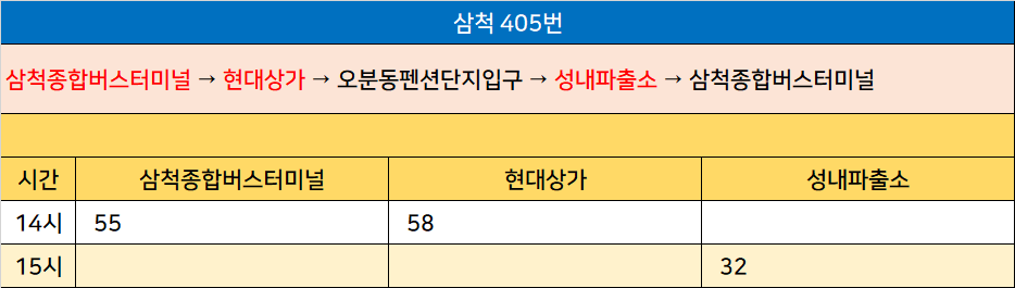 삼척 405번: 삼척종합버스터미널 → 현대상가 → 오분동펜션단지입구 → 성내파출소 → 삼척종합버스터미널