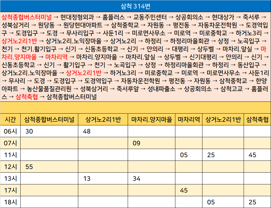 삼척 314번: 삼척종합버스터미널 → 현대정형외과 → 홈플러스 → 교동주민센터 → 상공회의소 → 현대상가 → 죽서루 → 성북삼거리 → 원당동 → 원당현대아파트 → 삼척중학교 → 자원동 → 평전동 → 자동차운전학원 → 도경역입구 → 도경입구 → 도경 → 무사리입구 → 사둔1리 → 미로면사무소 → 미로역 → 미로중학교 → 하거노3리 → 상거노2리1반 → 상거노2리.노익장마을 → 상거노2리 → 하정리 → 하정리마을회관 → 상정 → 노곡입구 → 천기 → 천기.활기입구 → 신기 → 신동초등학교 → 신기 → 안의리 → 대평리 → 상두벨 → 마차리.앞실 → 마차리.양지마을 → 마차리역 → 마차리.양지마을 → 마차리.앞실 → 상두벨 → 신기대평리 → 안의리 → 신기 → 신동초등학교 → 신기 → 활기입구 → 천기 → 노곡입구 → 상정 → 하정리마을회관 → 하정리 → 동산입구 → 상거노2리.노익장마을 → 상거노2리1반 → 하거노3리 → 미로중학교 → 미로역 → 미로면사무소 → 사둔1리 → 무사리 → 도경 → 도경입구 → 도경역입구 → 자동차운전학원 → 평전동 → 자원동 → 삼척중학교 → 한양아파트 → 농산물품질관리원 → 성북삼거리 → 죽서루앞 → 성내파출소 → 상공회의소 → 삼척고교 → 홈플러스 → 삼척축협 → 삼척종합버스터미널